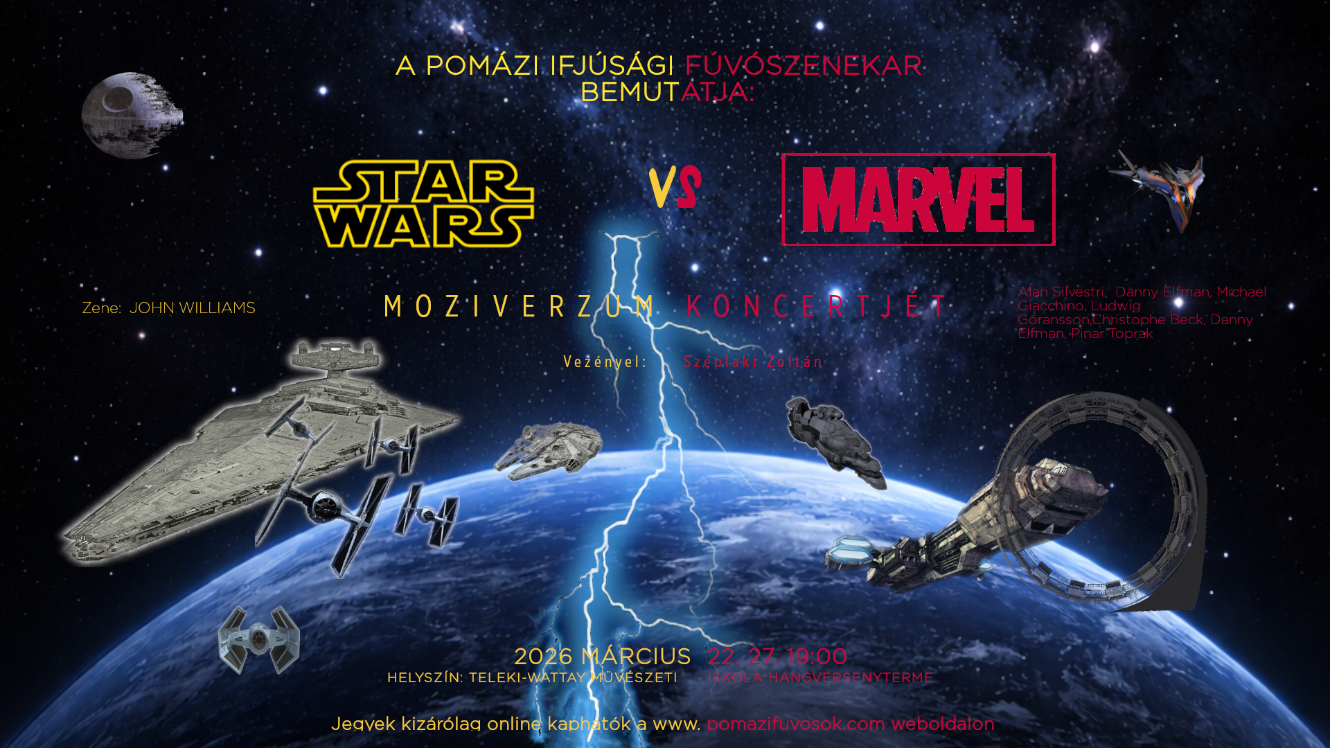 2026. március 22-én vasárnap és 27-én pénteken Star Wars VS Marvel Moziverzum című koncertünk 19 órakor kezdődik, melyre szeretettel várunk minden kedves érdeklődőt a Teleki-Wattay Művészeti Iskola hangversenytermébe.